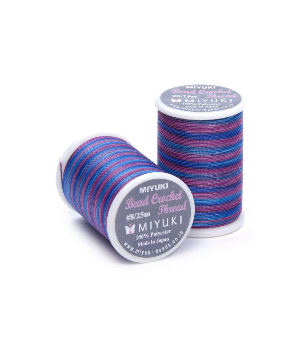 Hilo 100% polyester. Fabricado en Japón. Hilo trenzado de 0,45 mm de grosor. Especialmente fabricado para trabajos de crochet con rocallas. Lleva un tratamiento especial de resina para evitar que se deshilache. Las bobinas de colores son como se ve en la foto, multicolores, con el hilo cambiando de color.
