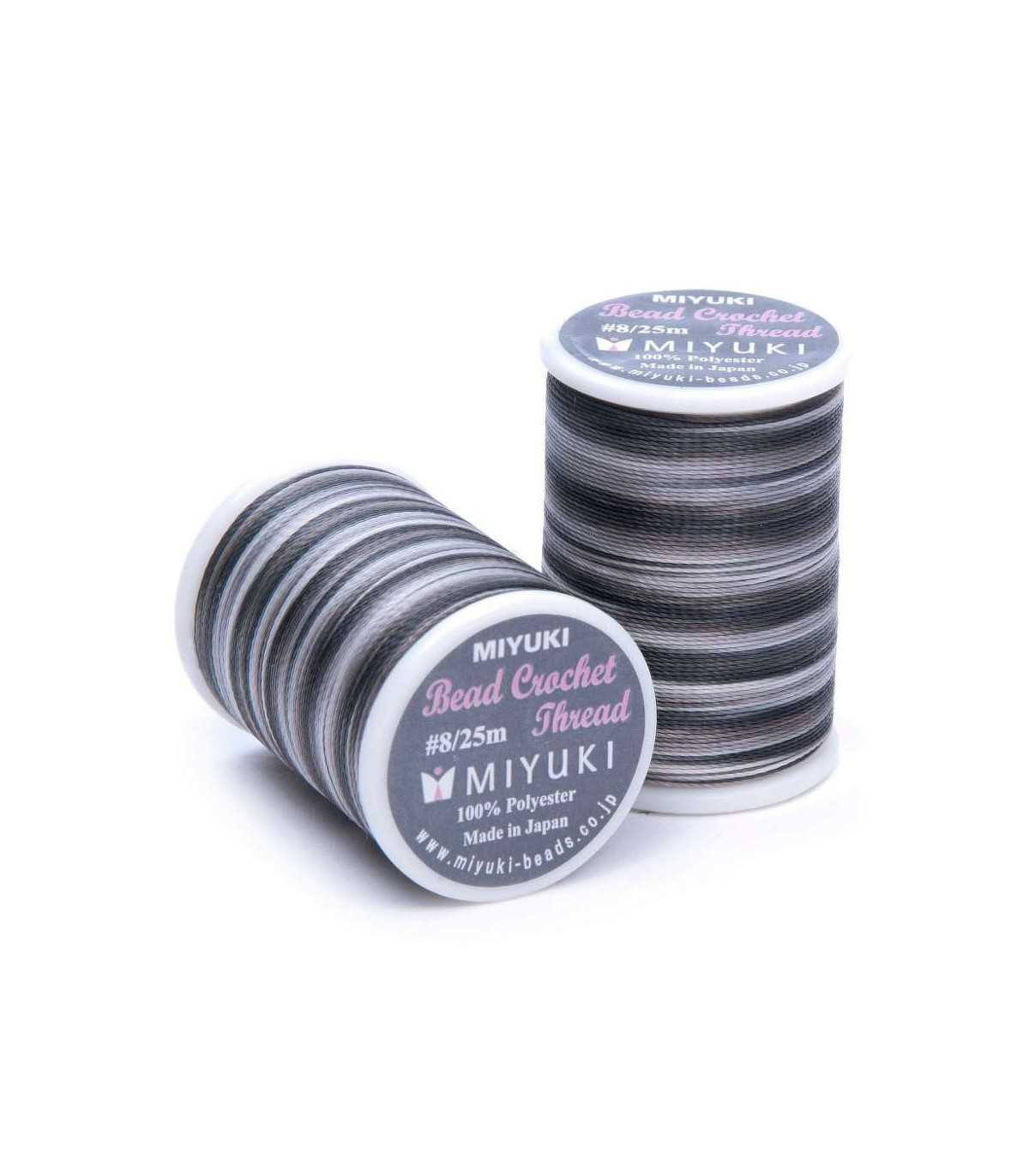 Hilo 100% polyester. Fabricado en Japón. Hilo trenzado de 0,45 mm de grosor. Especialmente fabricado para trabajos de crochet con rocallas. Lleva un tratamiento especial de resina para evitar que se deshilache. Las bobinas de colores son como se ve en la foto, multicolores, con el hilo cambiando de color.