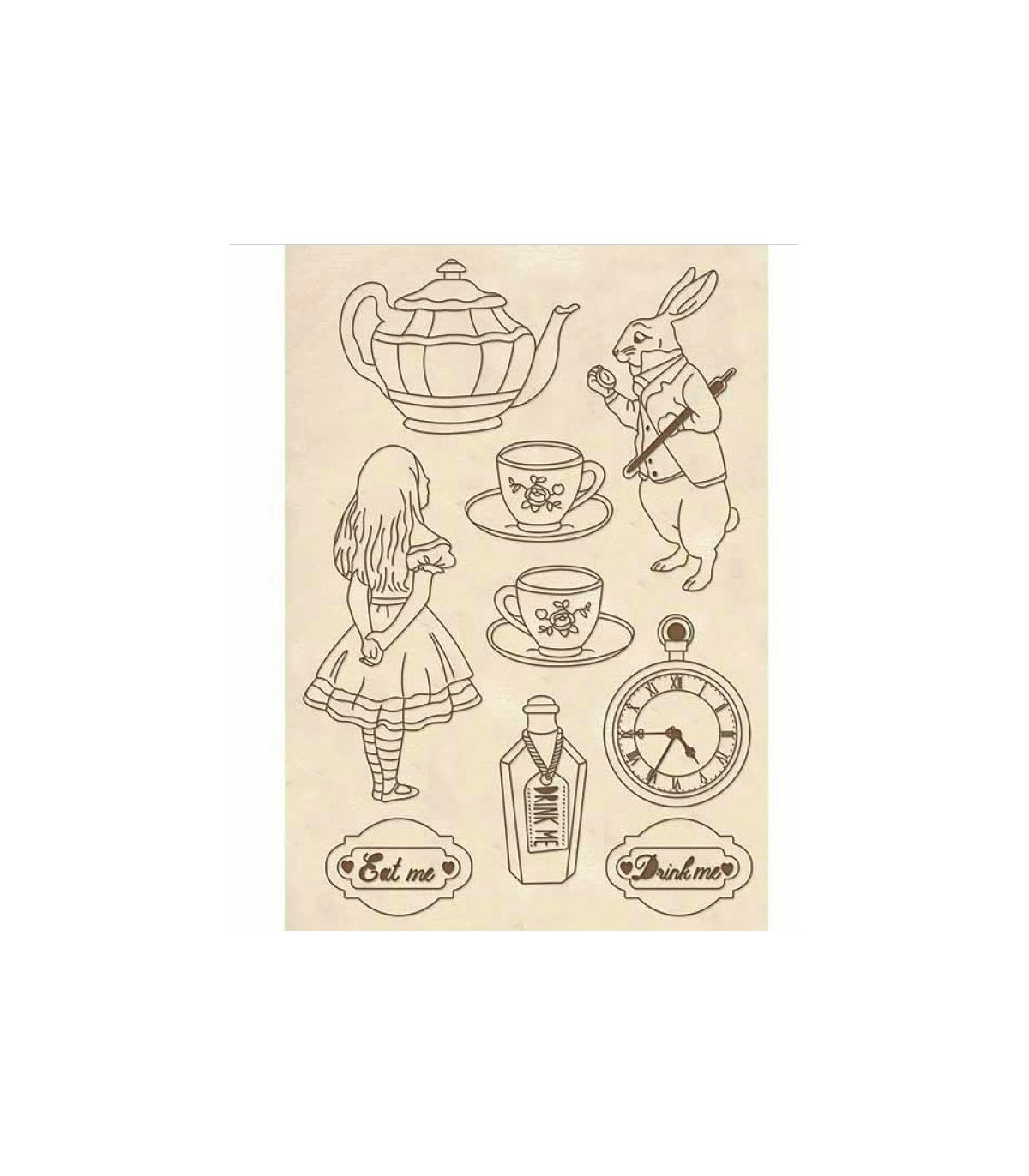 - Alicia, conejo, tazas, reloj, tetera, letreros.