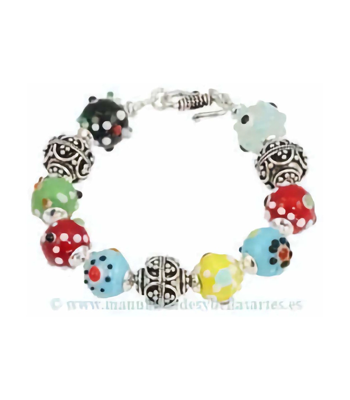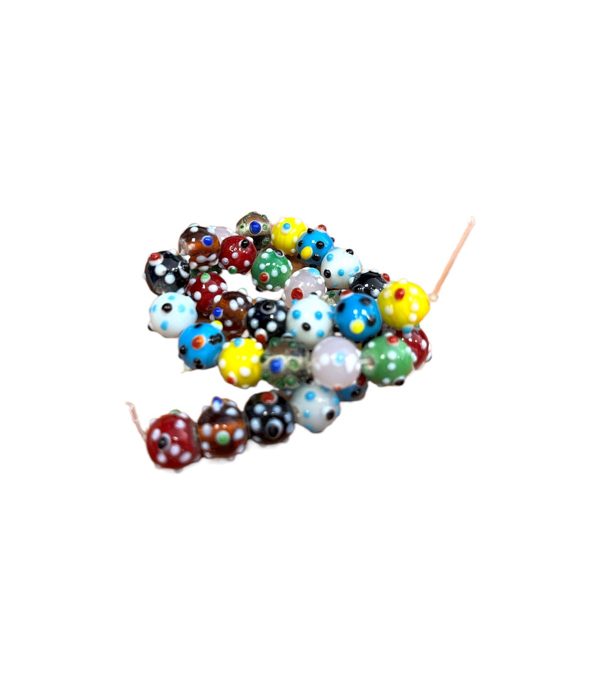 Hilo de unos 40 cm con unas 38 bolas artesanales de cristal de colores variados al azar con puntitos de cristal en relieve. Su carácter artesanal hace que las bolas no sean perfectamente esféricas y que puedan variar un poco de tamaño y color de unas a otras. Agujero para hilos y cables de hasta 1 mm aproximadamente. El mix se compone de más colores que los que se ven en la foto. Las bolas miden unos 12 mm incluyendo los puntitos que van en relieve. Estas bolas quedan muy bien con casquillas lisas y con bolas de plata con adornos de puntitos como en la pulsera que tenemos en la ficha del artículo.