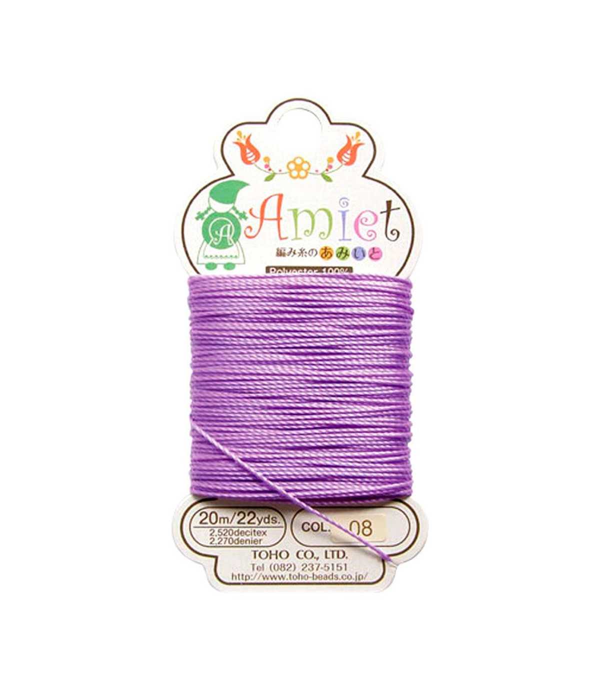 Hilo de polyester 100%, marca Toho Beads. Fabricado en Japón. Tiene la consistencia adecuada para poder enfilar rocallas 11/0 de Toho y otras marcas sin usar aguja. Ideal en tela y también en cuero. Diámetro de 2,52 decitex. Grosor de unos 0,5-0,7 mm. Ideal para hacer trabajos de crochet, macramé y Kumihimo con cuentas. Avajo de la ficha de producto ponemos ejemplos de uso cedidos por el fabricante, Toho Beads.