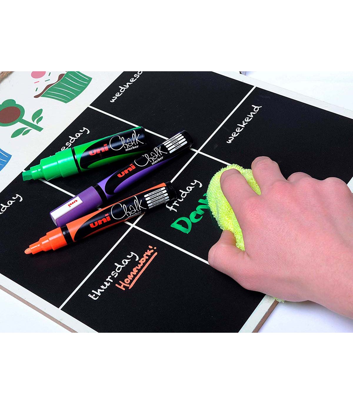 Marcador de tiza líquida con borrado en húmedo. Pinta sobre cualquier superficie y es ideal para pizarras negras, blancas, vidrio, ..., ya que su tinta resiste a la lluvia y a exteriores pero se borra fácilmente con un trapo húmedo. Ideal para anunciar menús , ofertas, ... Cuerpo de plástico reciclado. Punta de poliéster cónica. Trazo de 1,8 a 2,5 mm, medio. Tinta pimento. Incluye los colores blanco, azul claro, rojo, verde, rosa fluor, naranja fluor, lila y amarillo fluor.