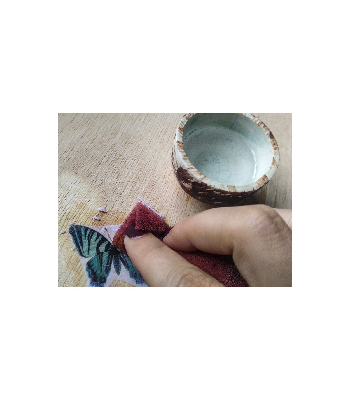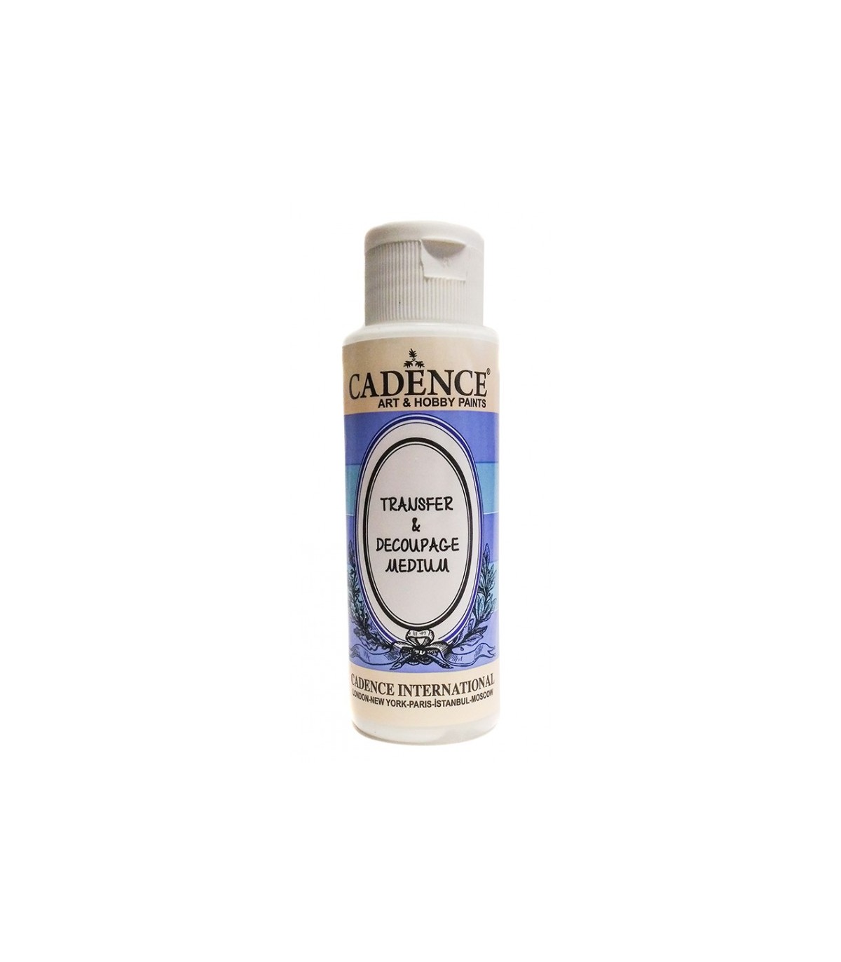 Medium con base de agua para transferir imagenes decorativas (como papel de decoupage, fotocopias) sobre otra superficie lisas como bandejas, tablones, lienzos y otras superficies porosas, se recomienda que la base de la superfice sea clara.