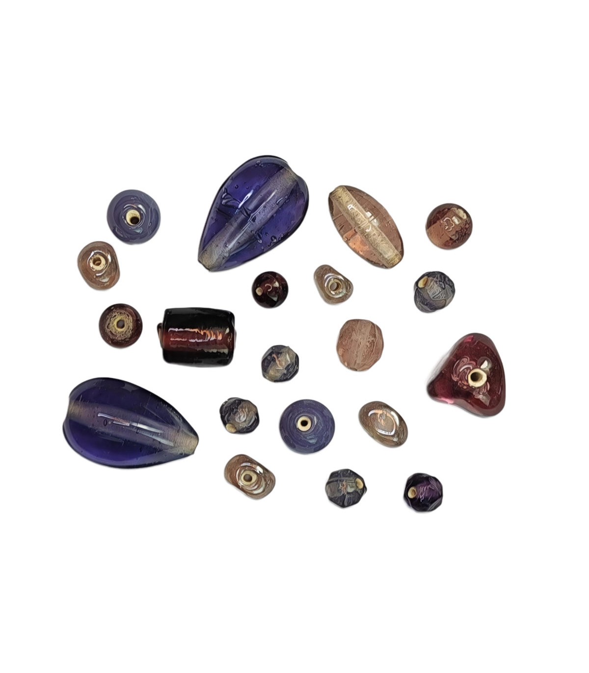 Agujero para hilos y cordones de 1 mm. Mix de formas variadas al azar en tonos morados o que combinan bien con ellos, ya están hechos y no se puede elegir. Las cuentas son muy variadas y en 100 gramos entran más o menos en función del tamaño de las que nos toquen, sólo como orientación decir que pueden ir unas 115 unidades. Medidas de 7 mm a 14 mm aproximadamente. Estas cuentas son muy rústicas, se considera normal que tengan rayas, efectos craquelados y que los agujeros no sean perfectos. Ideales en cadenas y en cordones con nudos para hacer pulseras, collares, llaveros, colgantes para móvil, con cañamo haciendo macramé, etc.