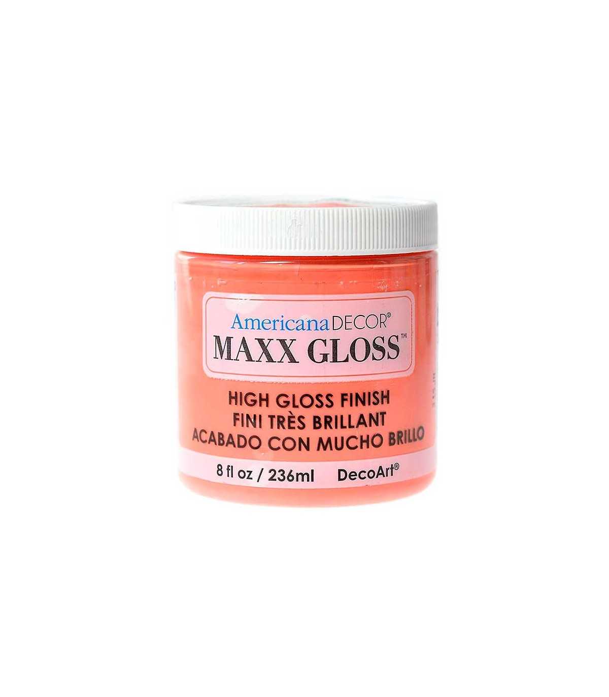 SUPER OFERTA A PRECIO POR DEBAJO DE COSTE! Maxx Gloss permite un acabado similar al lacado en aerosol en una pintura al agua no tóxica que se aplica con pincel o rodillo. Usar sobre madera, metal, vidrio, .... Para exteriores e interiores sin usar barniz encima, no precisa sellador. Es más fluida que otras pinturas, ver vídeo de Decoart para consejos de uso en la ficha del producto. Cubre unos 3,25 metros cuadrados sobre superficies selladas.