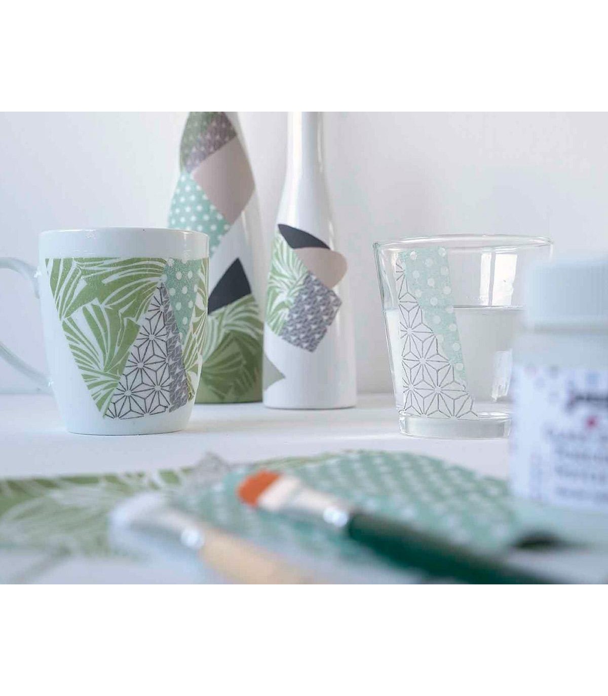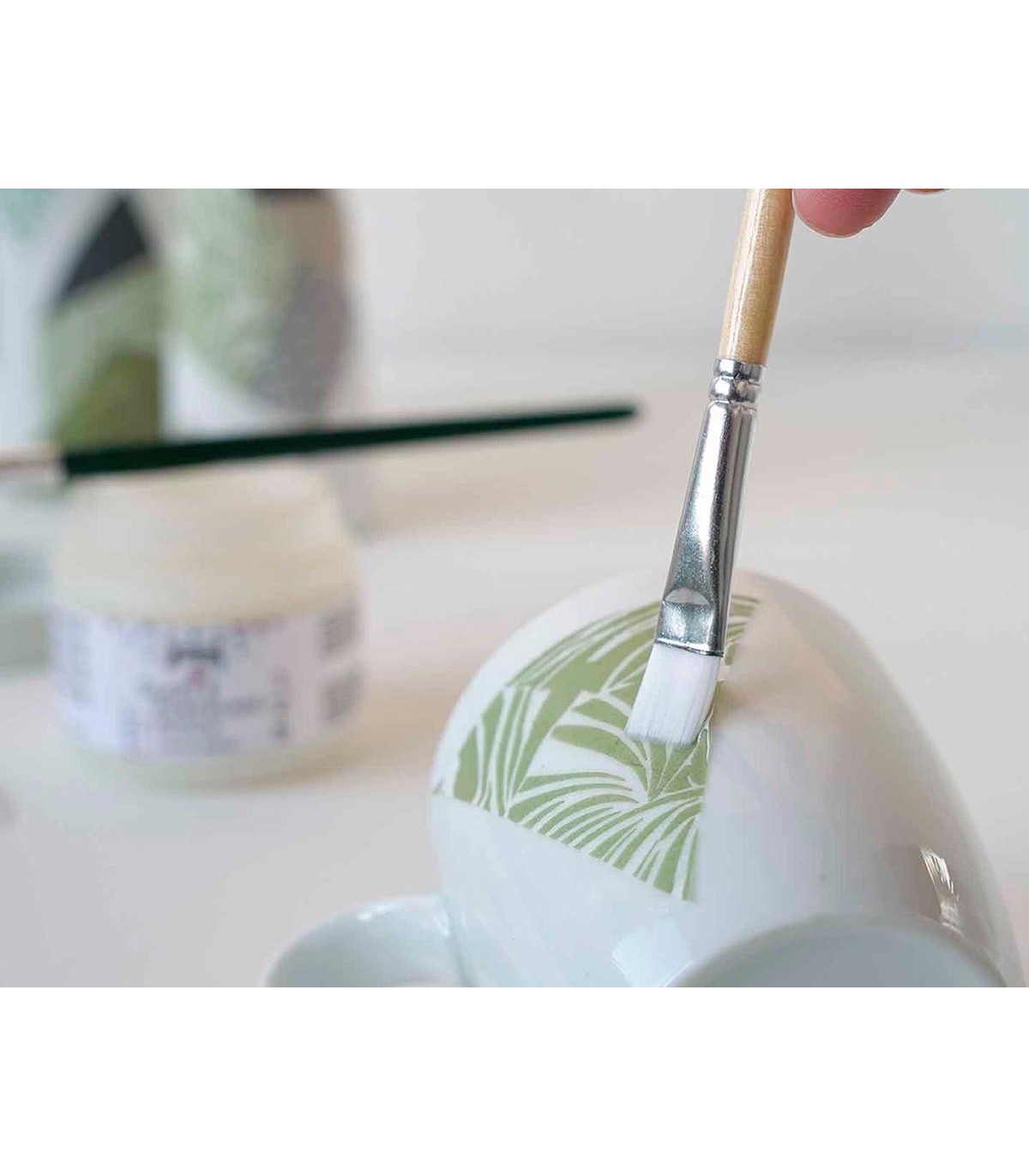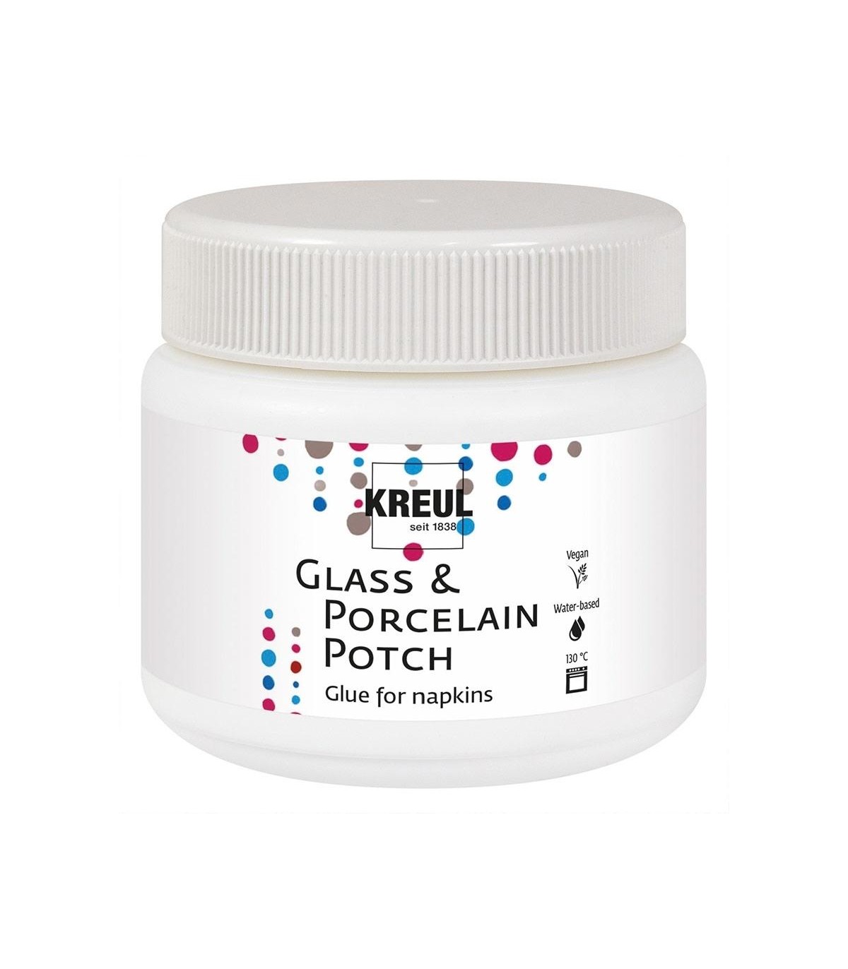 Cola y pegamento en uno, a base de agua. Para la técnica de las servilletas sobre porcelana. Aplicar una capa fina sobre la porcelana, en la zona dónde vamos a poner el motivo. Pegar la servilleta en el soporte. Poner Porcelana Potch sobre todo el motivo, fijando bien los bordes. Trabajar desde el centro hasta los bordes con un pincel suave. Antes del secado retirar el sobrante de cola de alrededor del motivo con un trapo húmedo. Una vez seco podemos combinar con detalles hechos con rotuladores para porcelana. Dejamos secar la porcelana decorada 4 horas. Cocemos a 130 ºC durante 90 minutos sin precalentamient. Dejamos enfriar. La porcelana decorada de esta manera resiste el lavado en lavavajillas. No decorar las zonas que vayan a estar en contacto con los alimentos ni con la boca. Agitar antes de usar. Proteger el bote del frío y del calor. Cerrar bien después de usar.