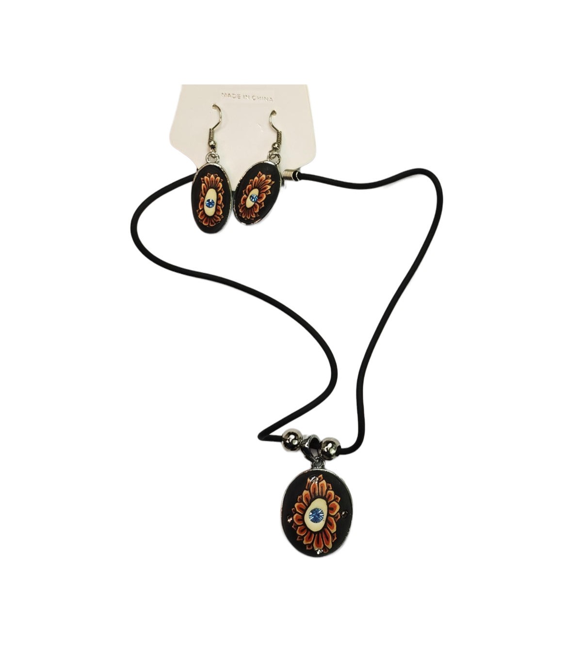 Óvalo del collar de unos 30x25 mm montado en fornitura de metal antialérgica. Óvalos de los pendientes de unos 25x14 mm, montados en fornitura metálica sin nickel también.